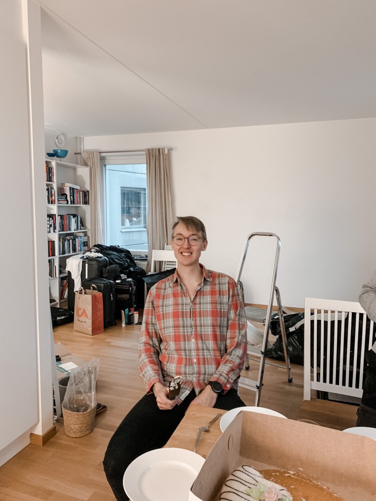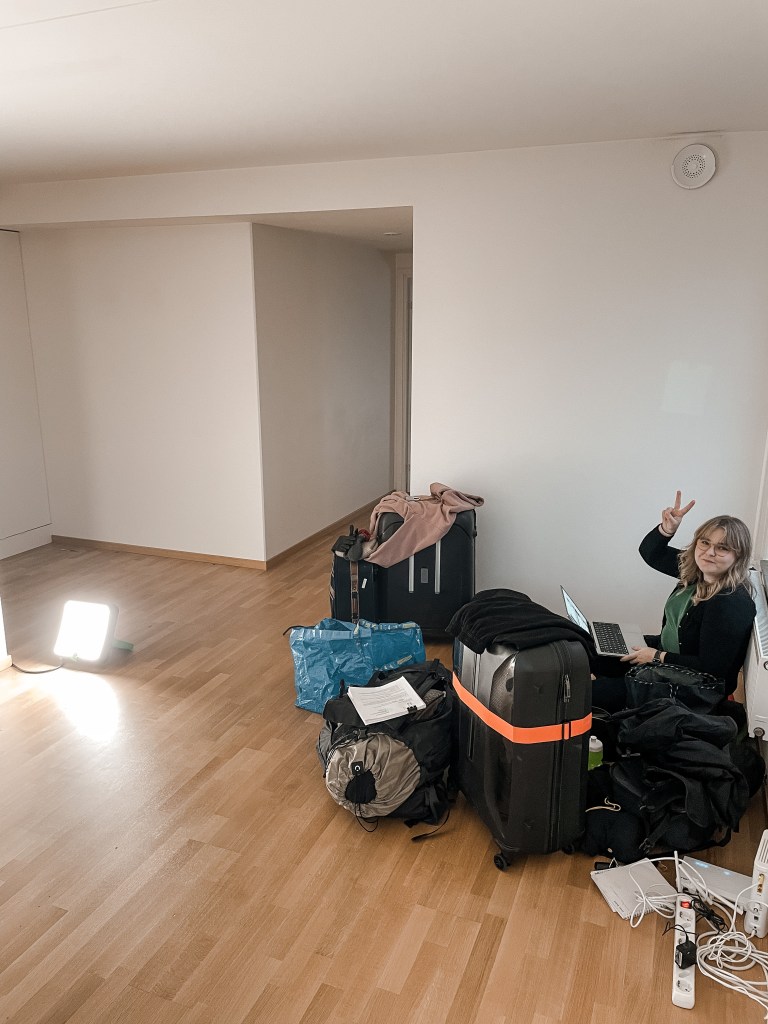 Här satt jag på golvet och rullade tummarna medan flyttfirman tömde lägenheten och till slut var det bara jag och våra väskor kvar. Känns sjukt att lägenheten är helt tom nu och vi inte ser våra saker på flera månader!