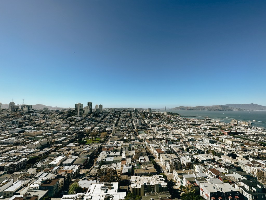 Väl uppe i tornet fick vi i alla fall en fantastisk 360°-vy över hela staden. Bort till höger på bilden ovan ser ni Golden Gate Bridge och någonstans där borta gömmer sig också Lombard Street.