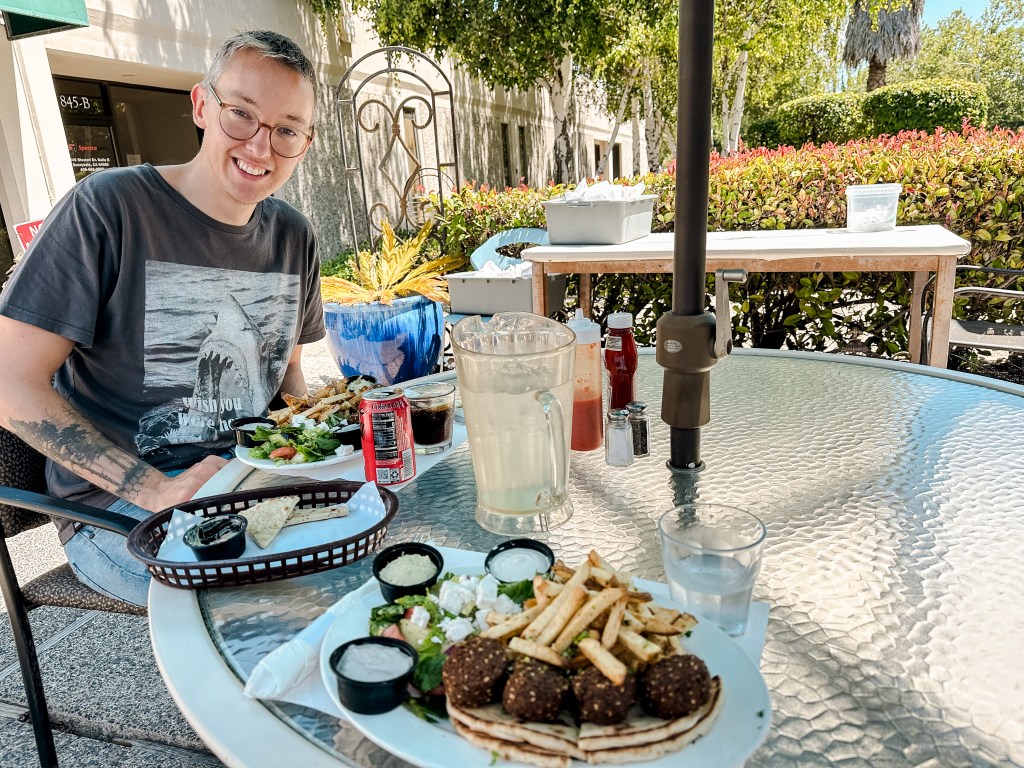 Allergikliniken ligger nära Linus kontor, så jag plockar upp honom med bilen och så äter vi lunch på ett grekiskt ställe i närheten. Glufsar i oss mumsiga falaflar och pitabröd. Fun fact: JÄTTEMYCKET mat serveras med pommes här, trots att det inte riktigt makes sense. Till exempel köpte jag en smörgås på ett café en gång, och den serverade med pommes till. Mycket märkligt.
