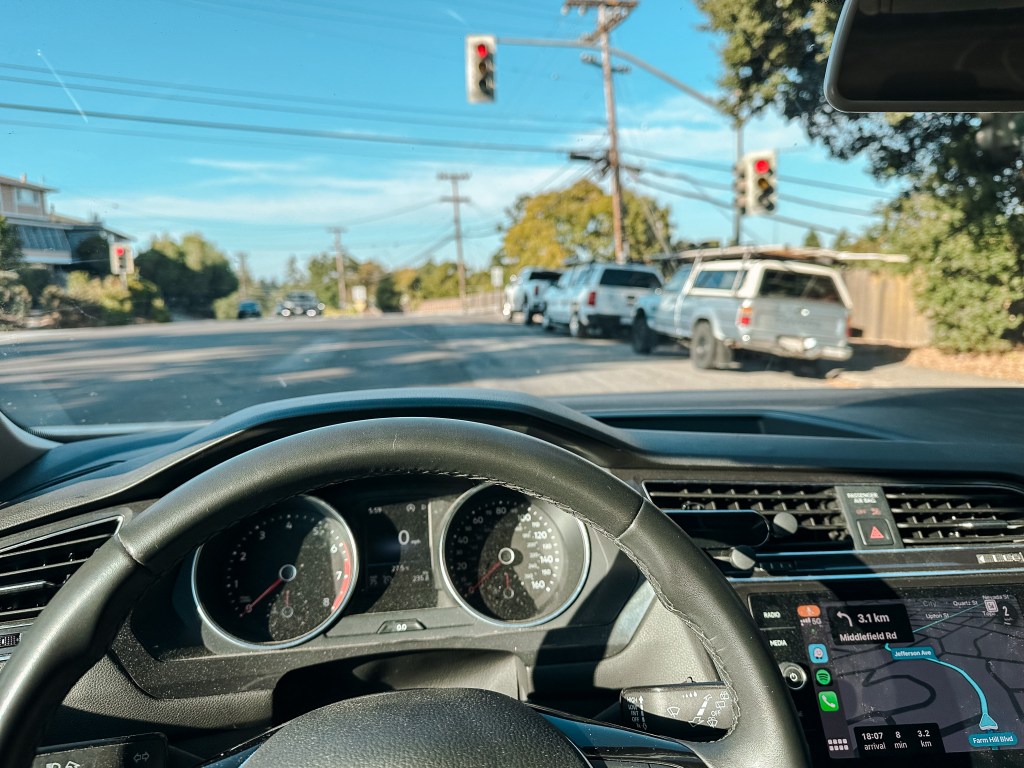 Väntar löjligt länge vid ett trafikljus, utan att några andra bilar korsar min väg. Klassiskt. Är på väg till Redwood City.