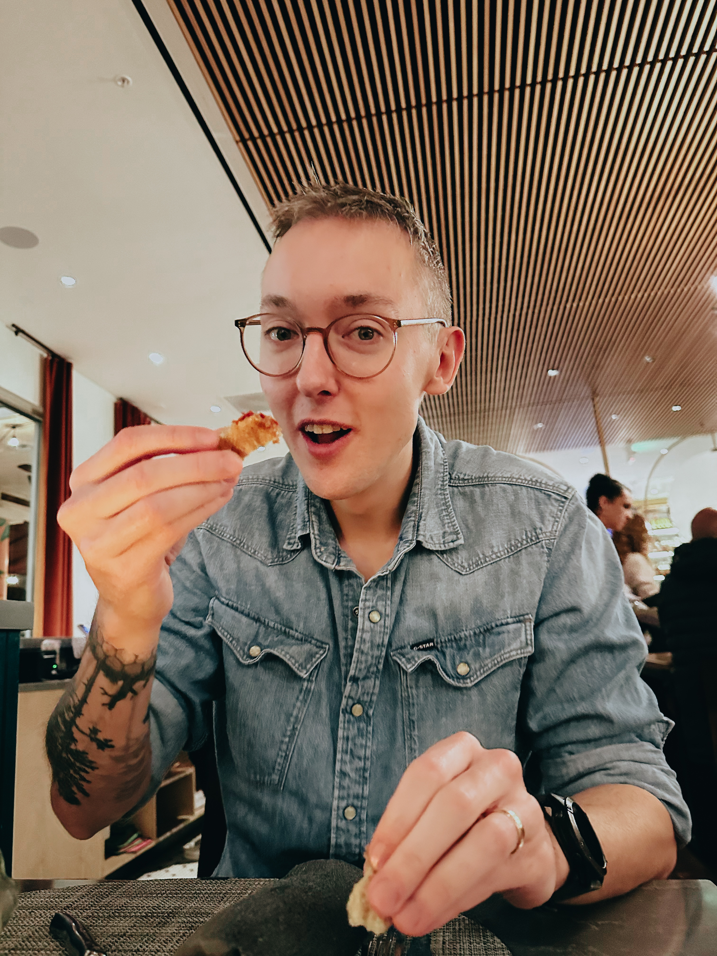 Till förrätt tog vi in bröd att dela på, supergod hemgjord foccacia. Jag beställde dagens soppa som lätt god men bara var en klar tomatsoppa med vita bönor, ingen höjdare direkt. Emilia tog in beignets (friterade degknyten) med äpplen och äpplesmör, prosciutto och blåmögelost. Riktigt gott!