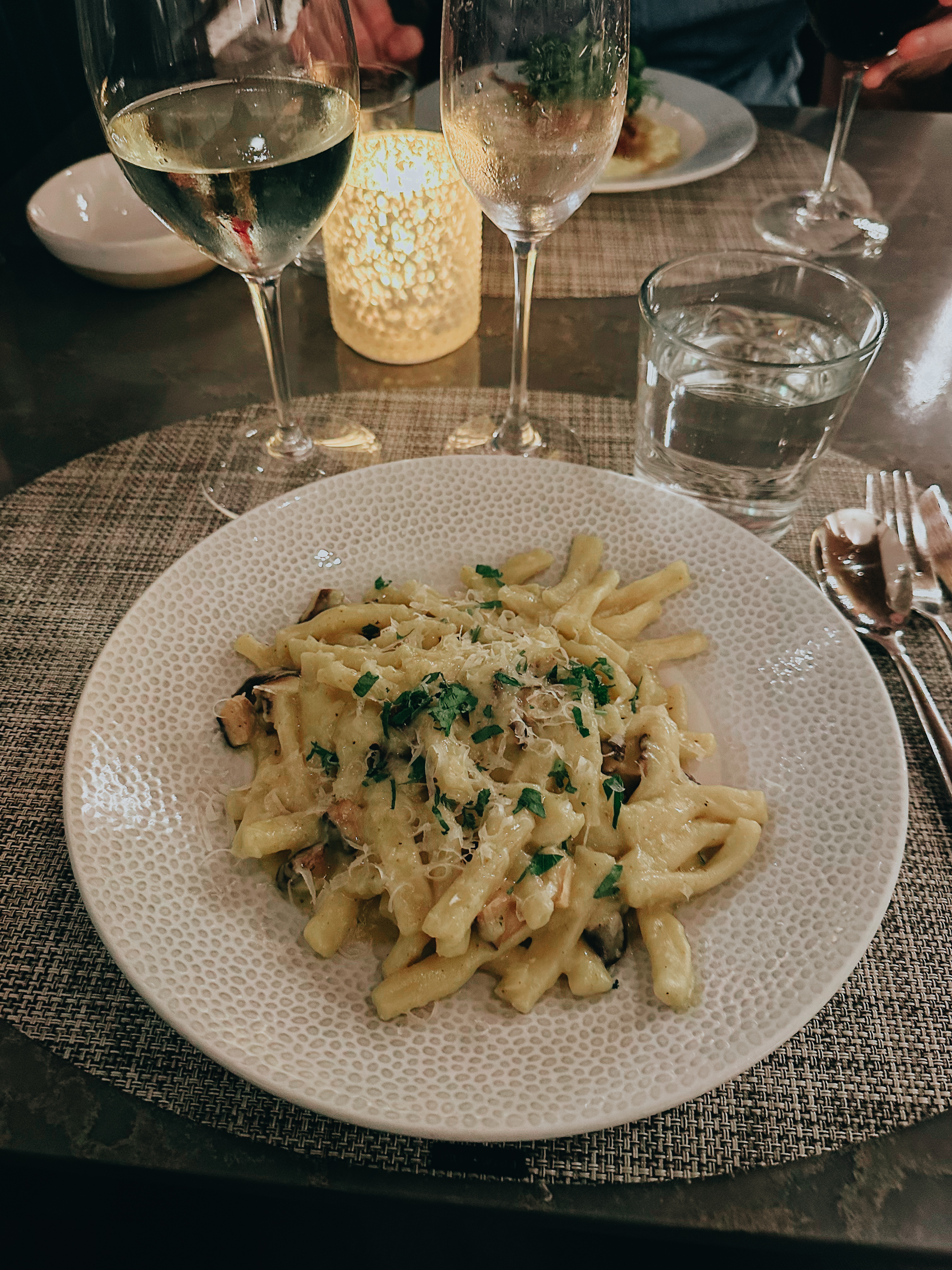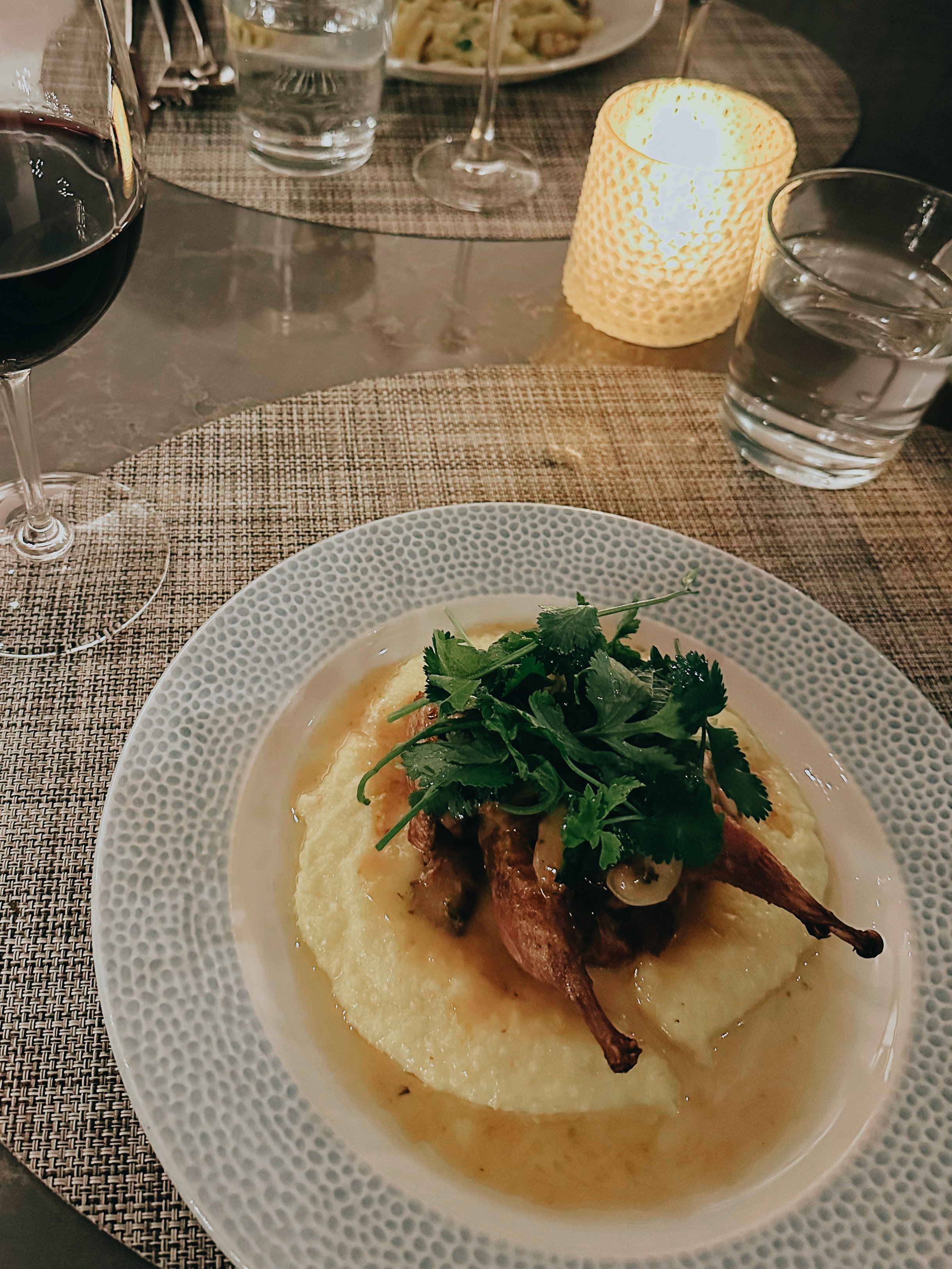 Varmrätt åt jag vaktel med ostig polenta och en lätt sås. Aldrig ätit vaktel men det var väldigt välgjort med otroligt god smak. Emilia käkade svamppasta, menyn är bytt och vi kommer inte ihåg vad det var exakt men gott var det!