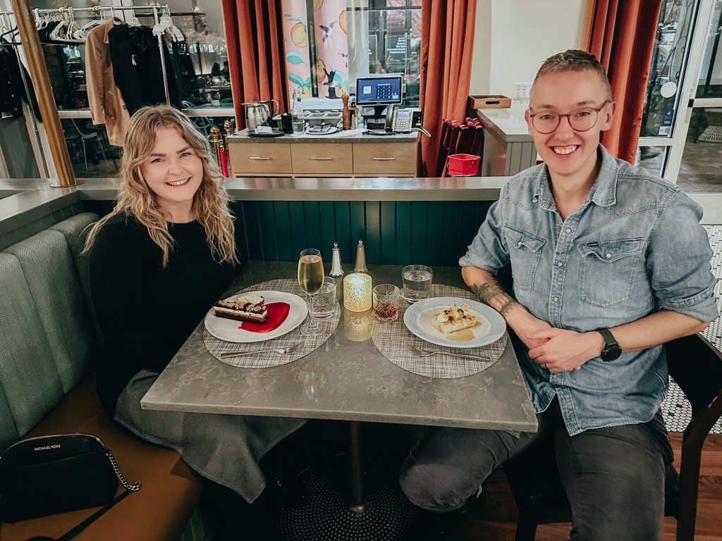 Till efterrätt, den bästa av rätter, käkade jag en ”Pineapple upside down cake” med pekannötter och vit chokladmousse. Emilia körde på en dekadent chokladmoussetårta med karamellmascarpone och hallon.